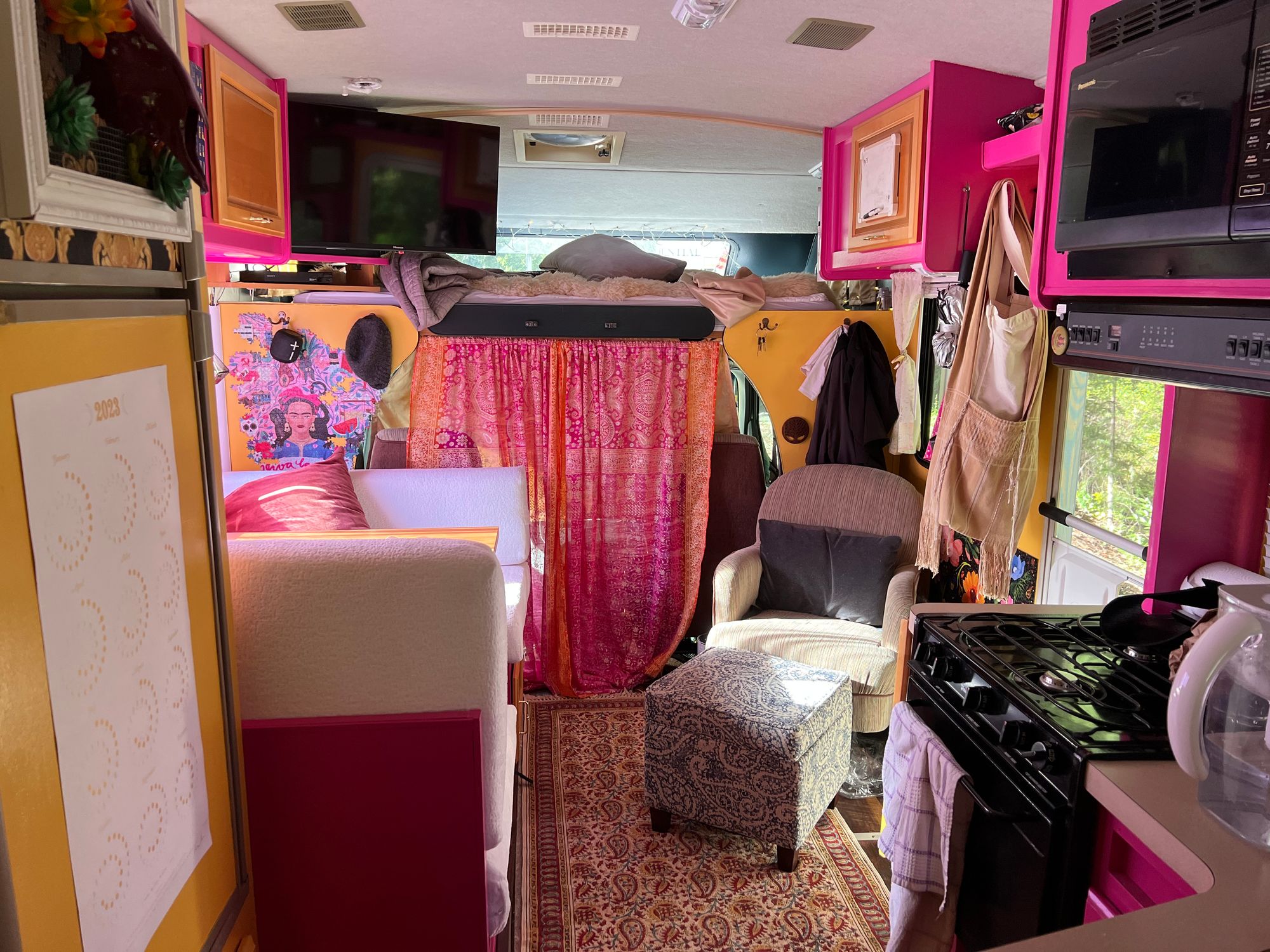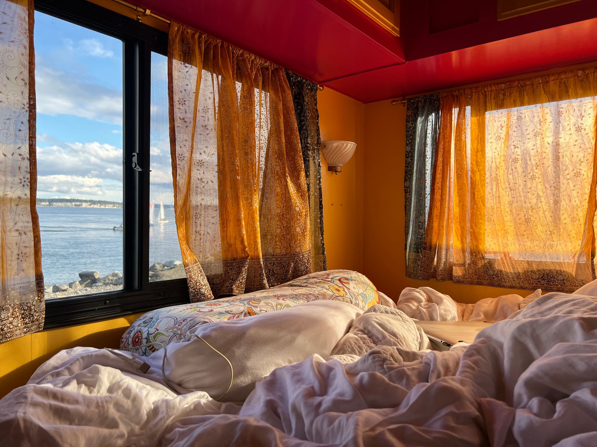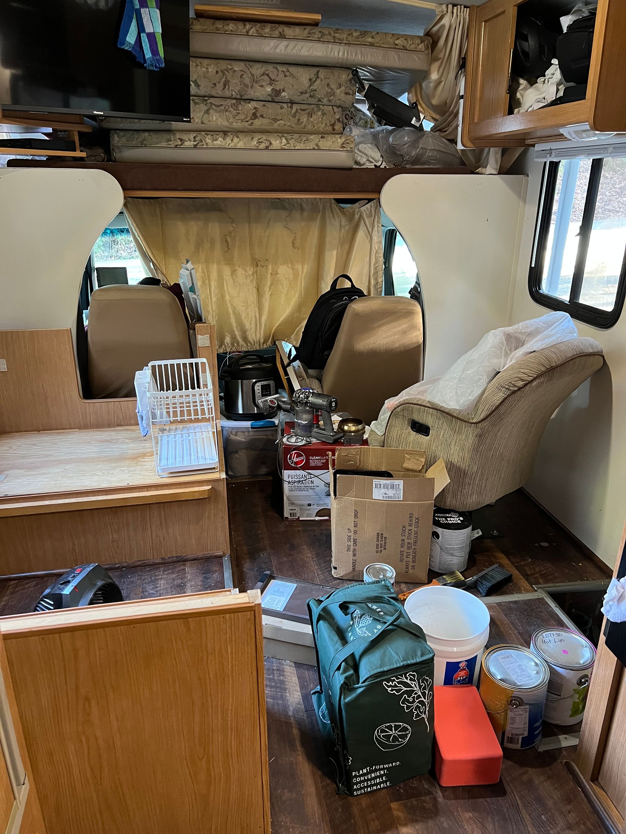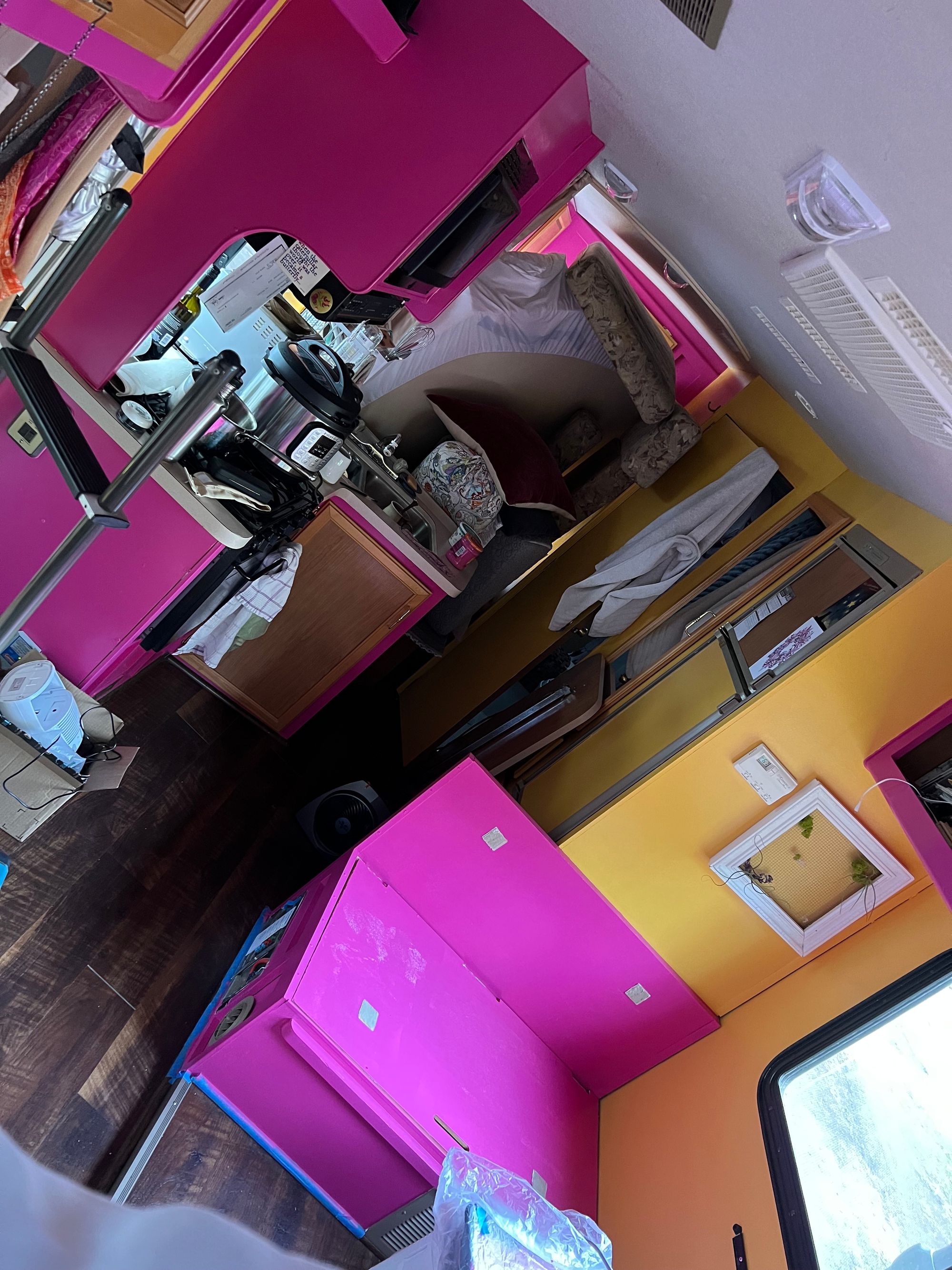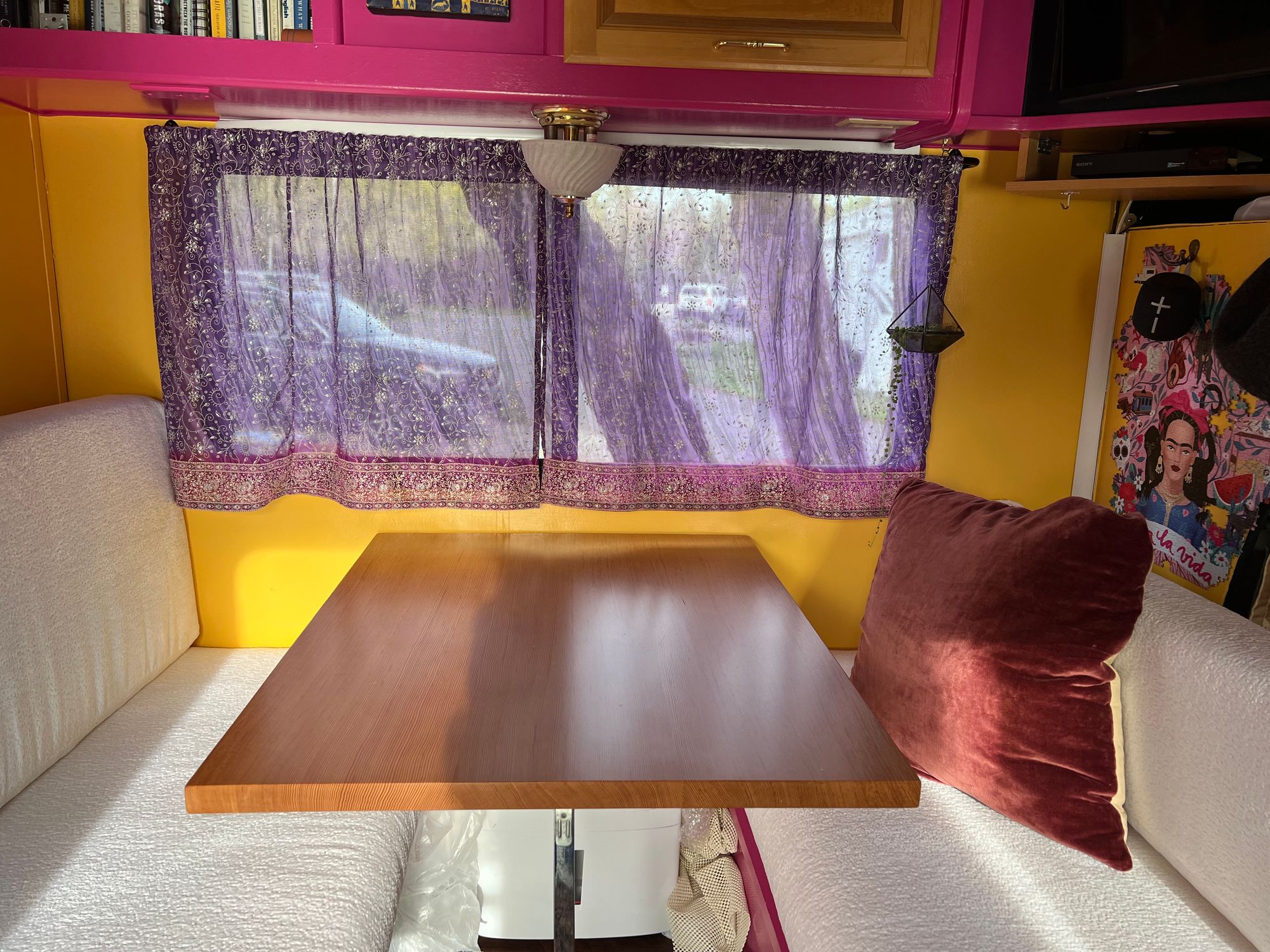 I don’t know why. She is a bit of an elegant cow, and maybe that’s it, or maybe it’s somewhat inspired by her previous owner, the nice old fishing geezer, who was very straight. (After he said “my ex-wife” several times about what sounded like several people, I asked, “You’ve been divorced more than once?”, to which he responded simply: “Oh yeah.”) It feels like an old-fashioned straight-guy name and gender for a vessel. It was indeed all very straight-guy, by which I mean cream-colored, when I moved in. But Bessie’s gotten a glowup. I did it under lightly harrowing circumstances, painting and renovating this little space while living inside it, for a month of which I had a burst pipe/no running water, and during a whole winter so I couldn’t get away from the mess by going and frolicking all day outside. And while all along, at every step, I wondered WHY I was bothering to do this, if I should even bother to do any of this.