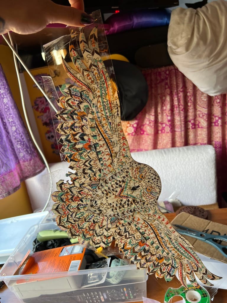 I purchased my first puzzle as an adult just days after I moved into Bessie. Before Bessie was even Bessie. I was driving around California trying to figure out where the fuck I was going to live/park/exist, let alone flourish, and I stopped at a grocery store I'd never been to in a town I’d never heard of and walked in to find, inexplicably, a display table stocked with beautiful puzzles.