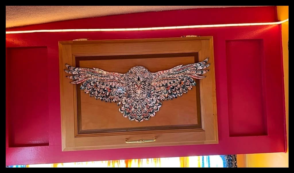 Recently, I’ve gotten into wooden puzzles. The pieces are thicker and heavier; puzzle glue isn’t strong enough to connect them. The first wooden puzzle I completed I put together with Gorilla rubberized sealant, which I applied only to the back in case it dried funky on the picture (it’s the octopus-shaped one poking up behind Thomas in the first photo). My second wooden puzzle was an owl I finished just last week. I put some plain-old cheap shipping tape across the front, just to hold the pieces together while I flipped it over to apply the sealant; I intended to peel the tape off after it dried. But once I had the tape on, I realized it looked fine, looked shellac’d, almost. So I hung it up, with some Gorilla mounting putty, on one of my cabinets, just like that.