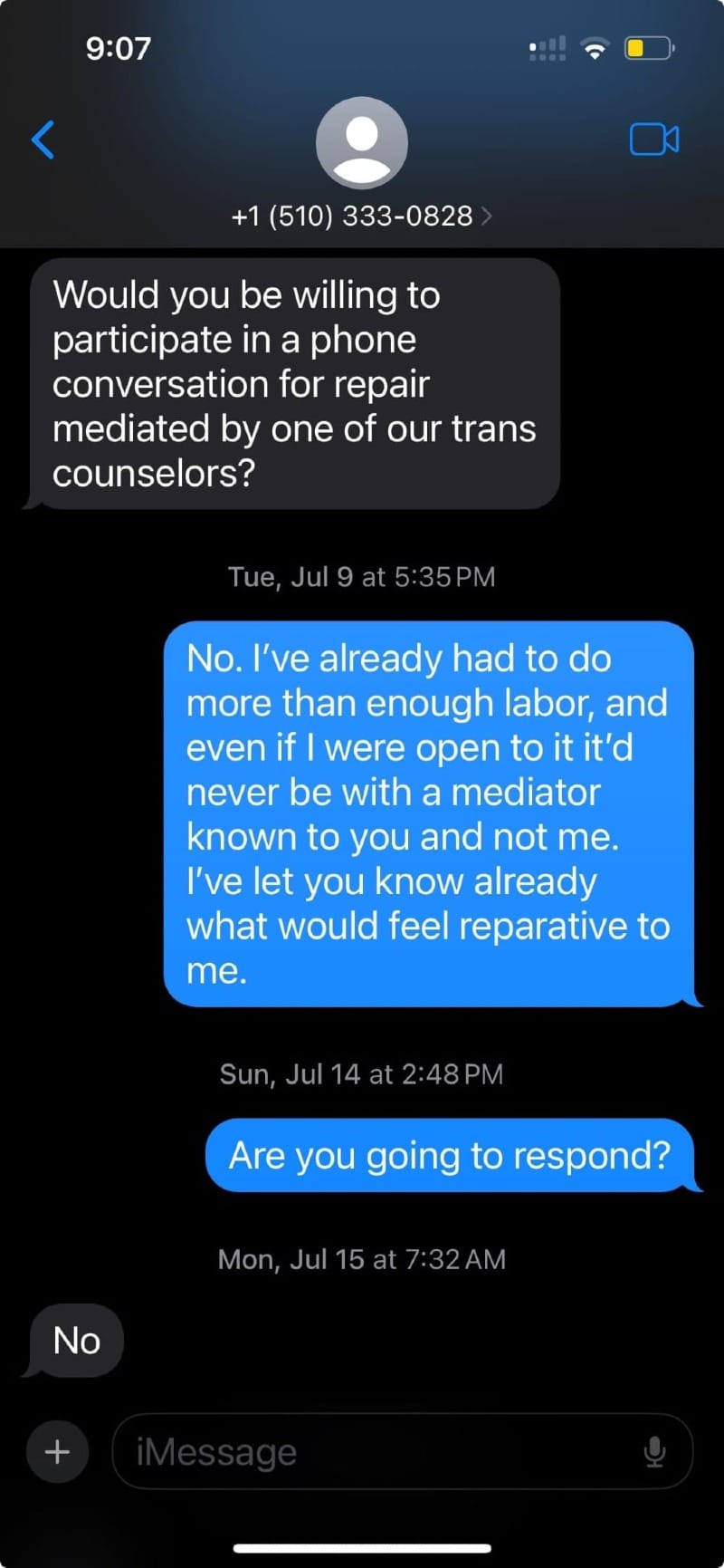 He asked if I’d talk on the phone instead—with “one of our trans counselors,” like a person he works with is an ethical referee, or a trans one makes it comfy for me, or my doing yet more work was reasonable. When I said no and restated my case, he, too, ignored me until I asked if he was going to respond.
